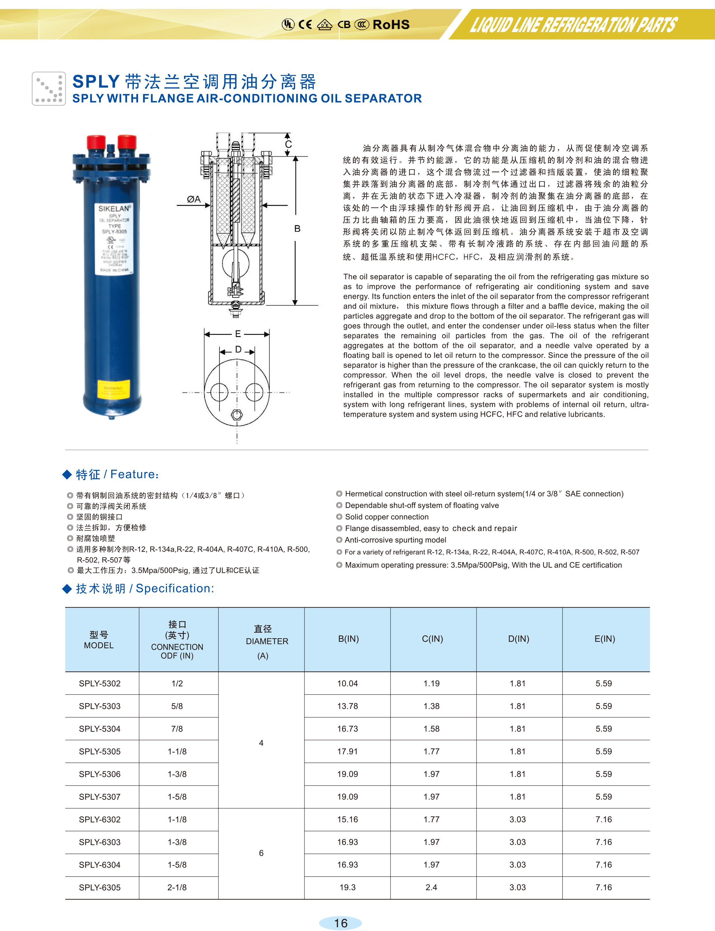 產(chǎn)品簡介:油分離器具有從制冷氣體混合物中分離油的能力,從而促使制冷空調(diào)系統(tǒng)的有效運行。并節(jié)約能源,它的功能是從壓縮機的制冷劑和油的混合物進入油分離器的進口,這個混合物流過一個過濾器和擋版裝置,使油的細粒聚集并跌落到油分離器的底部,制冷劑氣體通過出口,過濾器將殘余的油粒分離,并在無油的狀態(tài)下進入冷凝器,制冷劑的油聚集在油分離器的底部,在該處的一個由浮球操作的針形閥開啟,讓油回到壓縮機中,由于油分離器的壓力比曲軸箱的壓力要高,因此油很快地返回到壓縮機中,當油位下降,針形閥將關(guān)閉以防止制冷氣體返回到壓縮機。油分離器系統(tǒng)安裝于超市及空調(diào)系統(tǒng)的多重壓縮機支架、帶有長制冷液路的系統(tǒng)、存在內(nèi)部回油問題的系統(tǒng)、超低溫系統(tǒng)和使用HCFC,HFC,及相應(yīng)潤滑劑的系統(tǒng)。