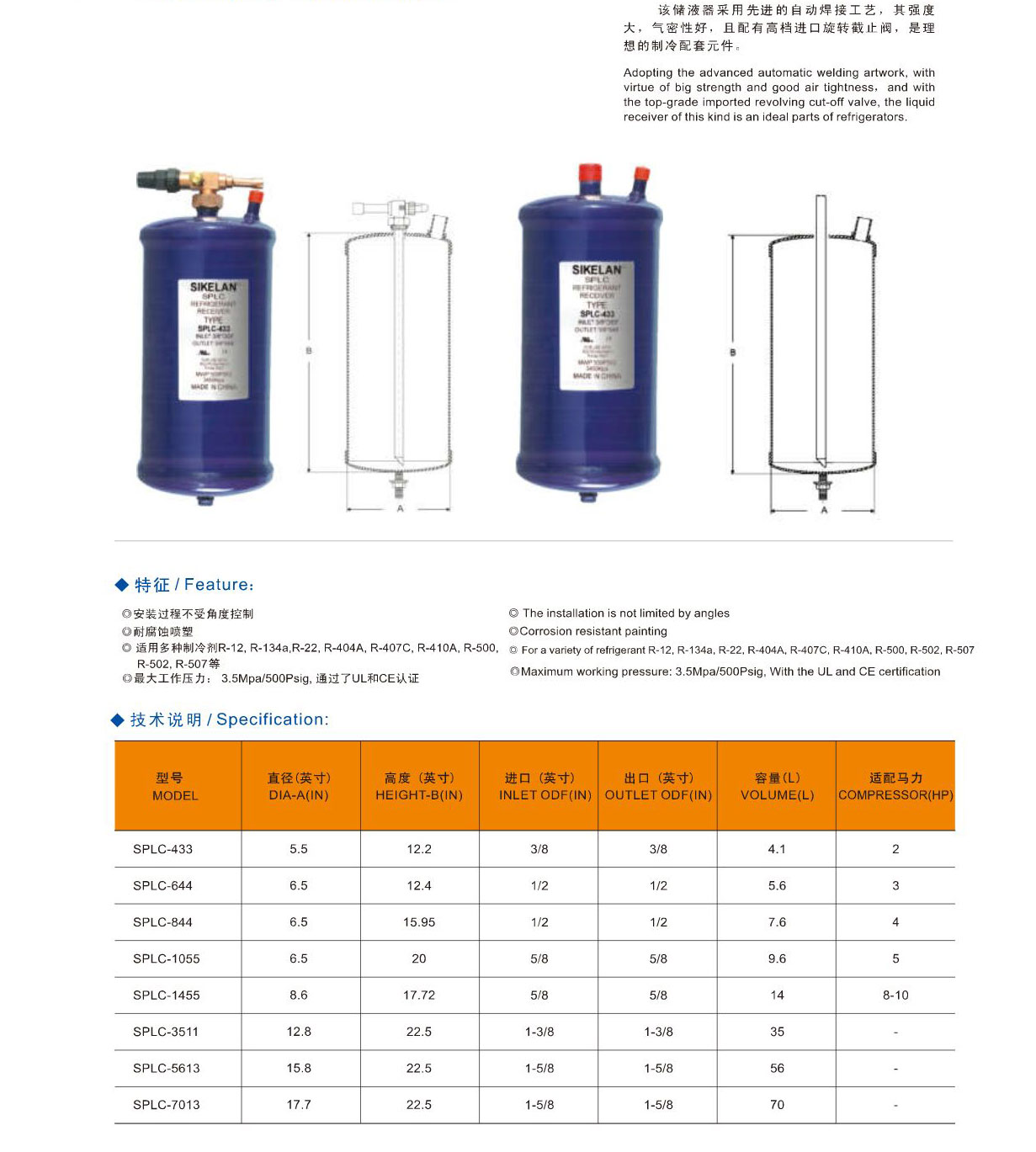 產品簡介:該儲液器采用先進的自動焊接工藝,其強度大,氣密性好,且配有高檔進口旋轉截止閥,是理想的制冷配套元件。