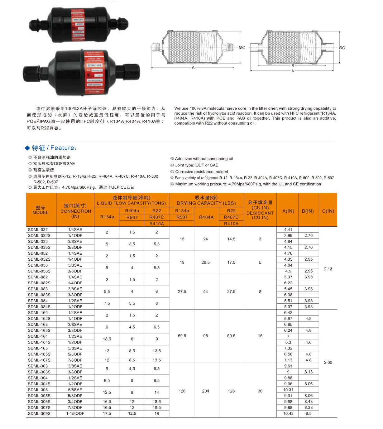 產品簡介:該過濾器采用100%3A分子篩芯體,具有較大的干燥能力,從而使形成酸(水解)的危險減至最低程度??梢宰罴训赜糜谂cPOE和PAG油一起使用的HFC制冷劑(R134A,R404A,R410A等)可以與R22兼容。