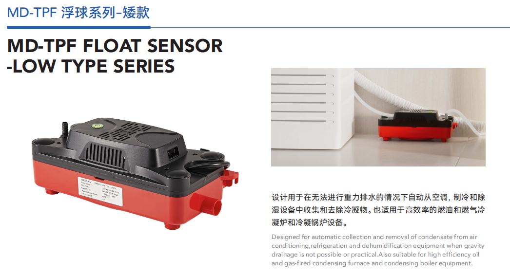 設計用于在無法進行重力排水的情況下自動從空調,制冷和除濕設備中收集和去除冷凝物。也適用于高效率的燃油和燃氣冷凝爐和冷凝鍋爐設備。